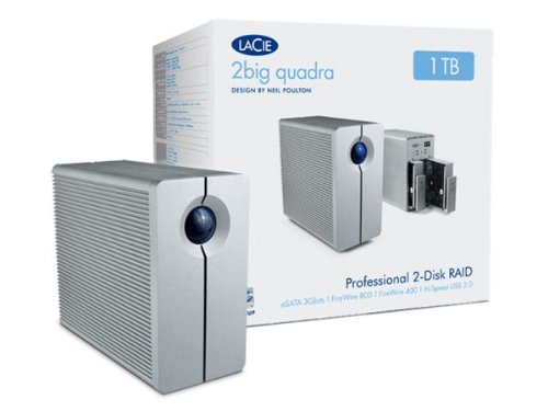- Lieferumfang: LaCie 2big Quadra, eSATA-eSATA-Kabel, FireWire 800-Kabel, FireWire 400-Kabel, Hi-Speed USB 2.0-Kabel, Netzteilsatz, Dienstprogrammen